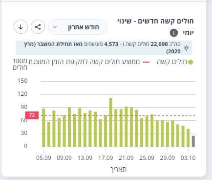 עדכון הקורונה של משרד הבריאות מצביע שוב על ירידה במספר החולים הקשים שמספרם ירד ל-564, אחרי שכבר עמד על יותר מ-710 לפני כשבועיים. בבתי החולים מונשמים 204 חולים.