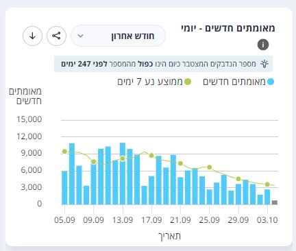 גם אתמול נמשכה המגמה של ירידה במספר הנדבקים עם נתון נמוך מאוד של 2,653 מאומתים חדשים ואחוז נבדקים חיובי שעומד על 2.83%, גם הוא נמוך יחסית לגל הקורונה בחודשיים האחרונים.