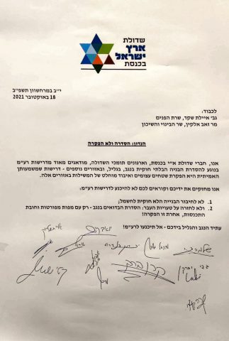חברי השדולה חתמו על מכתב לשרים איילת שקד וזאב אלקין ״אנו מחזקים את ידיכם וקוראים לכם לא להיכנע לדרישות רע"מ: לא בנוגע לחיבור בנייה לא חוקית לחשמל ולא לחזור על טעויות העבר בהסדרת הבדואים בנגב. חייבים לצרף מפה וחובת הסדרה אחרת זו הפקרה! עתיד הנגב והגליל בידכם – אל תיכנעו לרע”מ!״