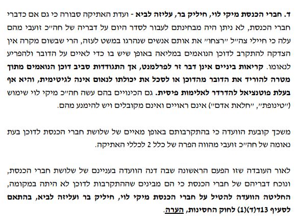"רק משמר הכנסת מנע את הסתערותו של חה"כ לוי לכיוון דוכן הנואמים בו עמדתי"… וציינה "הסתערותו האלימה של חה"כ לוי נצפתה ברבים, האיום הפיזי ונסיון ההתקרבות אלי יכולים להוות "מקור השראה" ועידוד למאות שאני פוגשת ברחוב ושהם גם כן לא "אוהבים את העמדות שלי", דבר אשר מסכן את חיי בצורה ממשית."