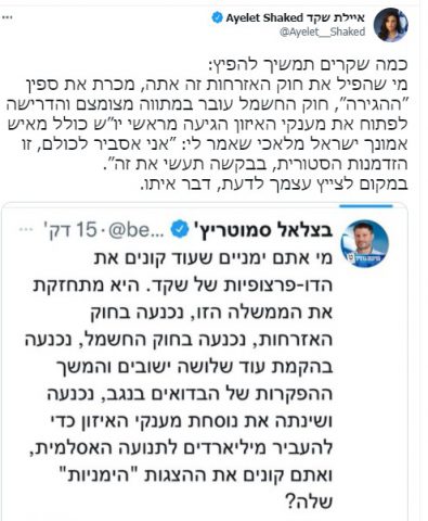 אמש, שקד תקפה את סמוטריץ בציות בטוויטר וכתבה: :כמה שקרים תמשיך להפיץ: מי שהפיל את חוק האזרחות זה אתה, מכרת את ספין ״ההגירה״, חוק החשמל עובר במתווה מצומצם והדרישה לפתוח את מענקי האיזון הגיעה מראשי יו״ש כולל מאיש אמונך ישראל מלאכי שאמר לי: ״אני אסביר לכולם, זו הזדמנות הסטורית, בבקשה תעשי את זה״. במקום לצייץ עצמך לדעת, דבר איתו".