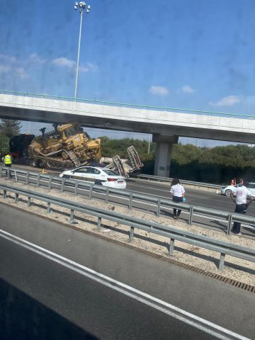 משאית כבדה (סמי טריילר) הנושאת עליה דחפור פגעה לפי זמן קצר (שלישי) בגשר במחלף נתב"ג וסטתה הצידה. בעקבות התאונה כביש 1 מנתב"ג לכיוון מערב נחסם לתנועה במשך 4 שעות.