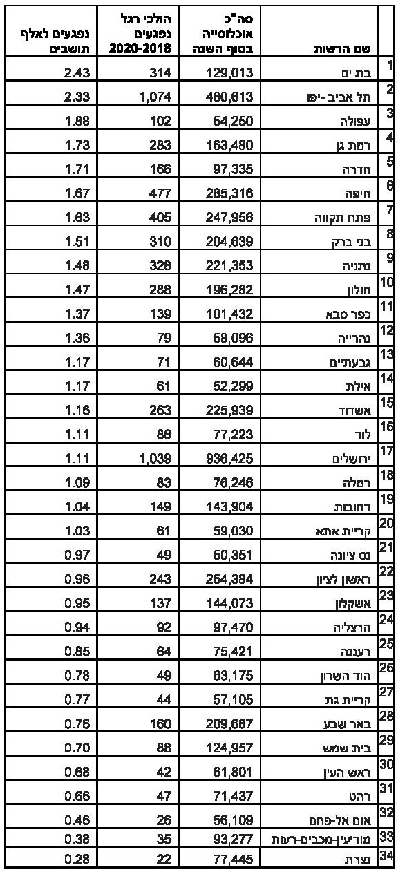 בבת ים נפגעו 314 הולכי רגל בשלוש השנים האחרונות – 2.43 הולכי רגל נפגעים בתאונות דרכים בהשוואה לכל אלף תושבים. תל אביב-יפו נמצאת במקום השני עם 1,074 הולכי רגל נפגעים בשלוש השנים האחרונות – 2.33 הולכי רגל נפגעים בתאונות דרכים לכל אלף תושבים.