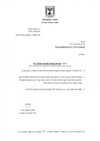 במכתב מ‏לשכת פרקליט המדינה נכתב "במענה לפנייתך נשיבך כי עניין זה נמצא כעת בבחינה בפני היועץ המשפטי לממשלה לאחר ‏השלמת בחינת העניין בפני פרקליט המדינה. ישיבה בעניין בפני היועץ המשפטי לממשלה ‏צפויה במועד קרוב, ובהמשך לכך תינתן החלטה בעניין", נכתב.