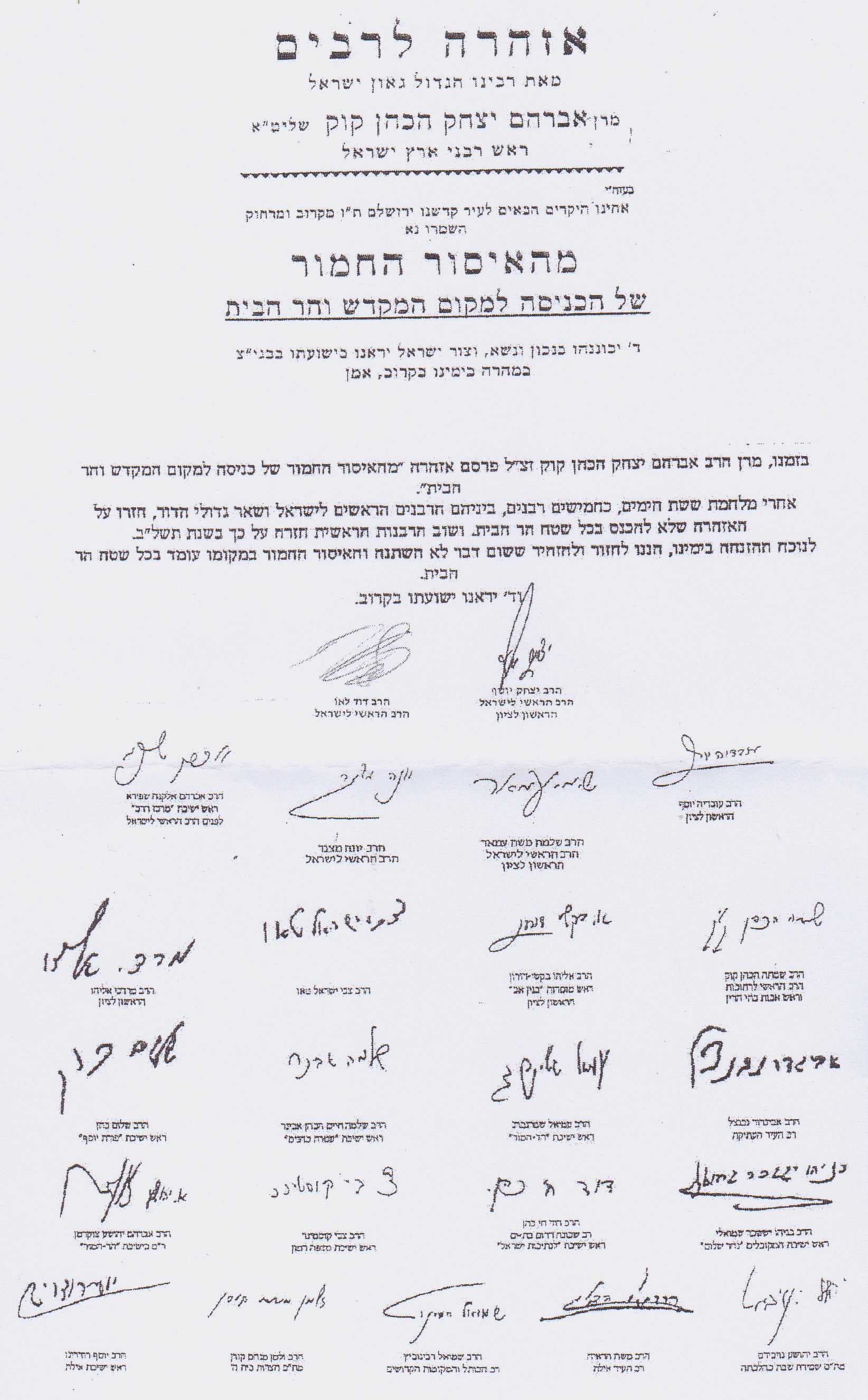 "אך בהיות ובתקופה האחרונה כל מיני ארגונים קוראים אל הציבור לעלית אל הר הבית, הננו לגלות בזה דעת תורה, כי האיסור בתוקפו עומד, ואיסור מוחלט לעלות אל הר הבית בזמן הזה."