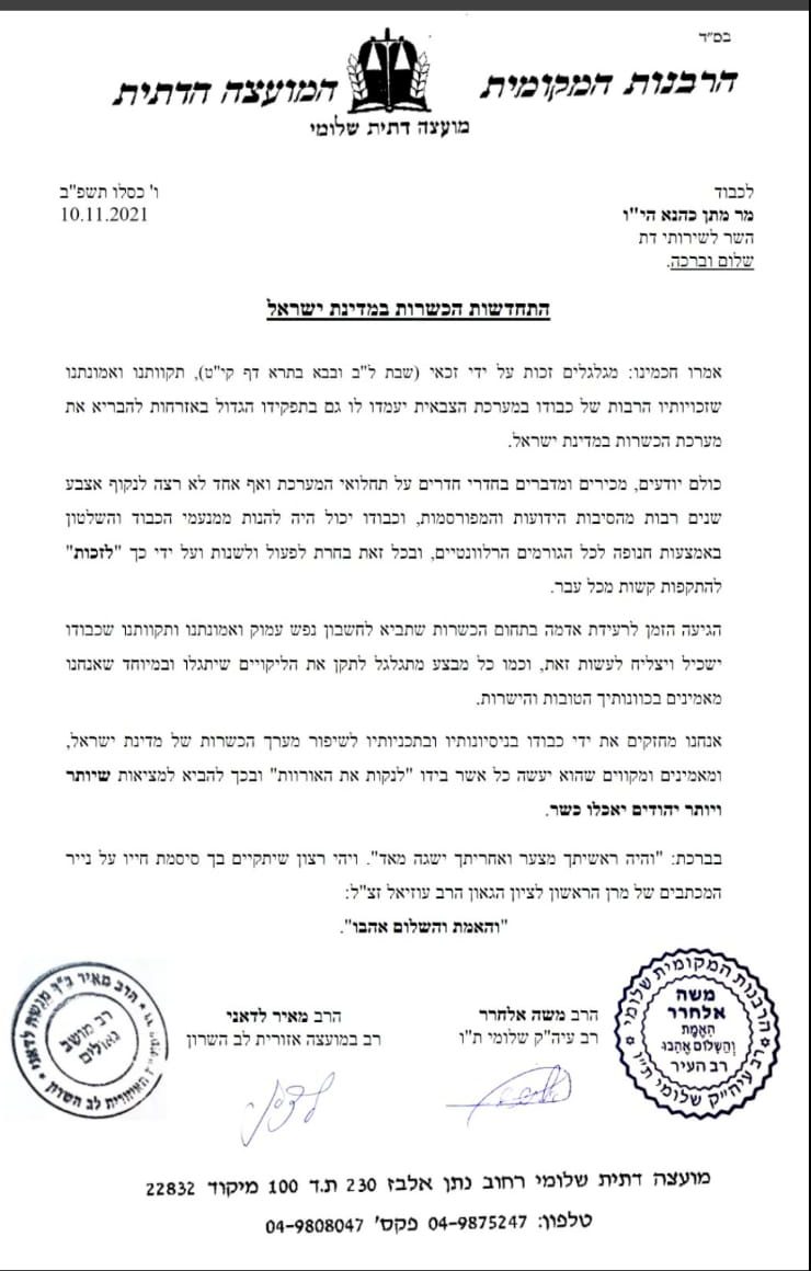 שני רבני ישובים נוספים מצטרפים לתמיכה ברפורמת הכשרות של השר כהנא. אחרי שהשבוע פרסמנו את מכתב התמיכה של רבה של עפולה, מצטרפים היום הרב משה אלחרר רב העיר שלומי, והשני הרב מאיר לדאני מהמועצה האזורית לב השרון.