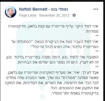 לפיד עקץ את בנט על "הקיצוניים" שנבחרו בפריימריז של הבית היהודי ועל התקלות הטכניות שגרמו לדחיית הפריימריז בליכוד, ובנט החזיר לו בעקיצה (כשהוא מגן על הליכוד!): "יאיר לפיד היקר: עדיף פריימריז עם קצת בלאגן, מדיקטטורה מסודרת." ובהמשך: "דע לך, יאיר: אני מעדיף דמוקרטיה ופריימריז עם בלאגן, מאשר מפלגה "מסודרת" כמו שלך, אשר המנהיג שלה מחליט לבד הכל: את הרשימה, את השרים, את המדיניות, את החוקה את התקנון ואת ההסכמים. הכל. בדיקטטורה באמת יותר מסודר."