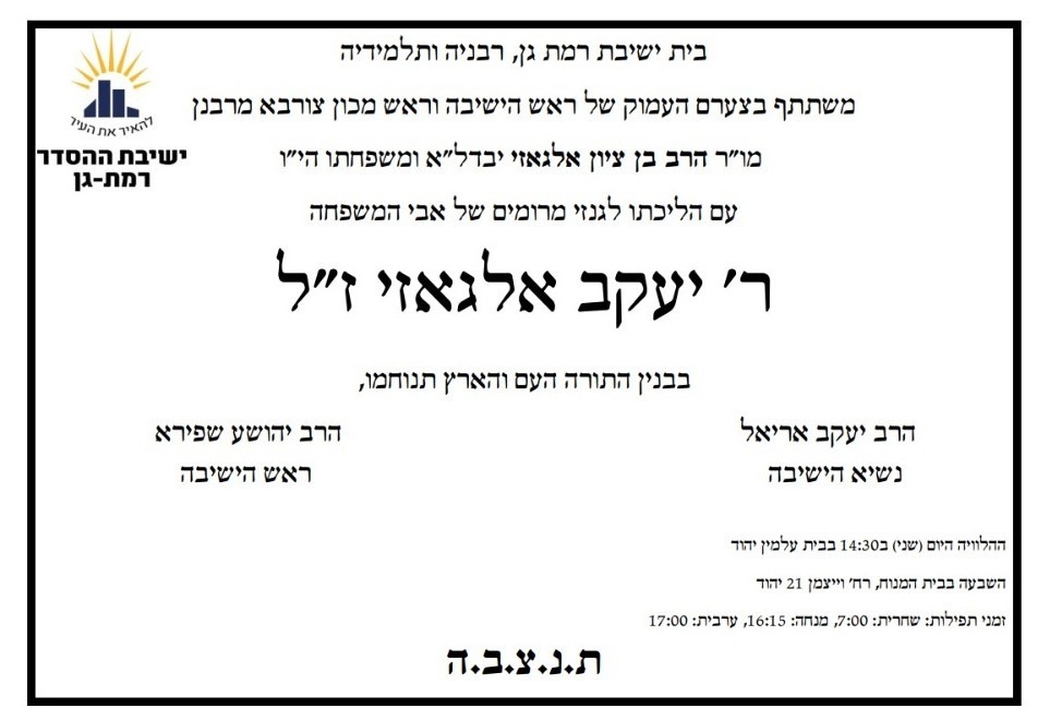 ברוך דיין האמת. הלך לעולמו יעקב אלגאזי ז"ל אביו של ראש ישיבת רמת גן וראש מכון 'צורבא מרבנן' הרב בן ציון אלגאזי.