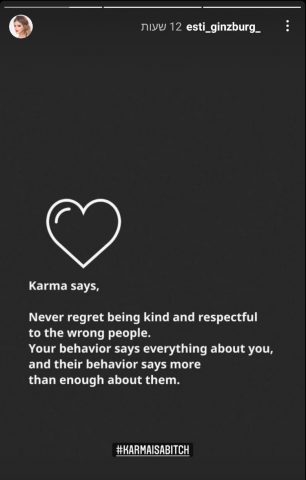 גיזנבורג אינה נשארה חייבת והעלתה תמונה עם הכיתוב "קארמה אומרת, אל תשכח להיות טוב לב ומכבד לאנשים הלא נכונים. ההתנהגות שלך אומרת הכל עליך".