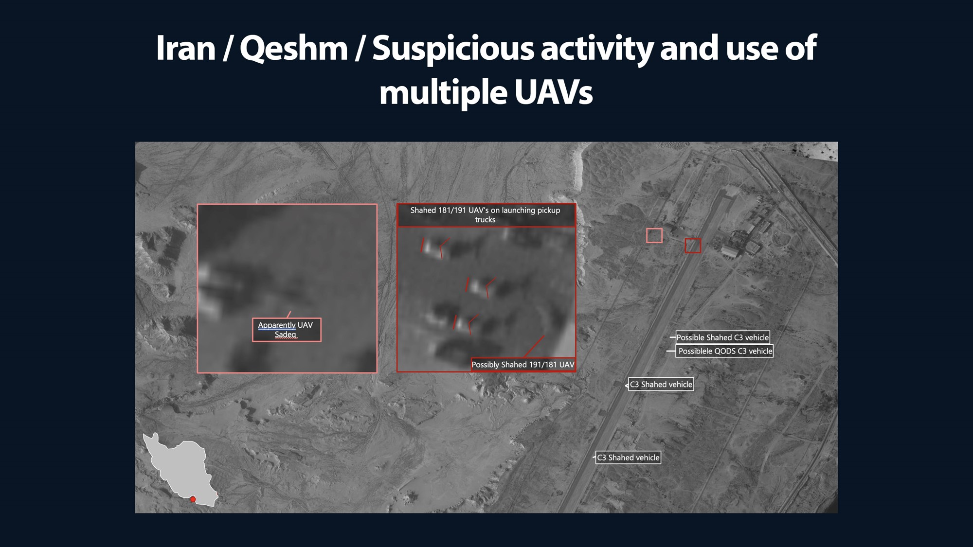 גנץ חשף, כי איראן מבצעת תקיפות באמצעות כטב"מי נפץ באמצעות שלוחיה וגם משטחה והציג שני בסיסים מרכזיים באזור שאבהאר ובאי קשם בדרום איראן, שמהם בוצעו פעולות לעבר המרחב הימי ושבהם ממוקמים גם היום כטב"מים תוקפים מתקדמים מסוג שאהד."