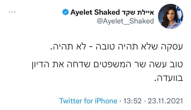 נציגת ימינה בוועדה, השר איילת שקד ברכה על הדחייה: