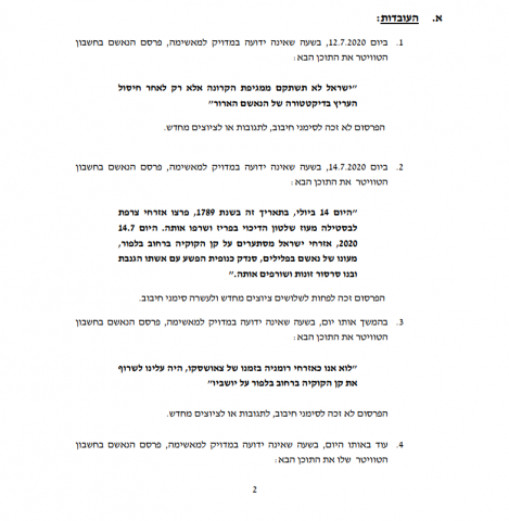 "סוף הנאשם לתליה כפי שאזרחי רומניה עשו למנהיג המושחת צאושסקו" (19.07.2020). עוד צייץ הנאשם: "אזרחי ישראל בדרכם לקן הקוקיה ברחוב בלפור יעשו לנאשם ולכנופית בלפור השוכנת שם, את אשר הנאשם המושחת עשה ליצחק רבין ב 5.11.1995, ואת אשר אזרחי רומניה, עשו, בעקבות אירועי המהפכה הרומנית (1989) הודחו ונתלו במרכז העיר, שליטי רומניה הקומוניסטית, ניקולאה צ'אושסקו ורעיתו אלנה צ'אושסקו" (2.8.2020).