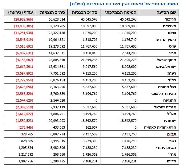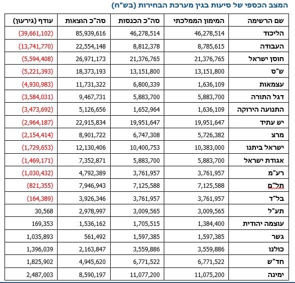 הליכוד שהביא שיא מנדטים נכנס לחובות של 39 מיליון שקלים ממערכת הבחירות, מפלגת העבודה הביאה הישג פושר מאוד ושוב נקלעה ל-13 מיליון שקלים חובות. עוצמה יהודית שהתקרבה מאוד לאחוז החסימה סיימה את מערכת הבחירות ברווח של כ-170,000 שקלים.