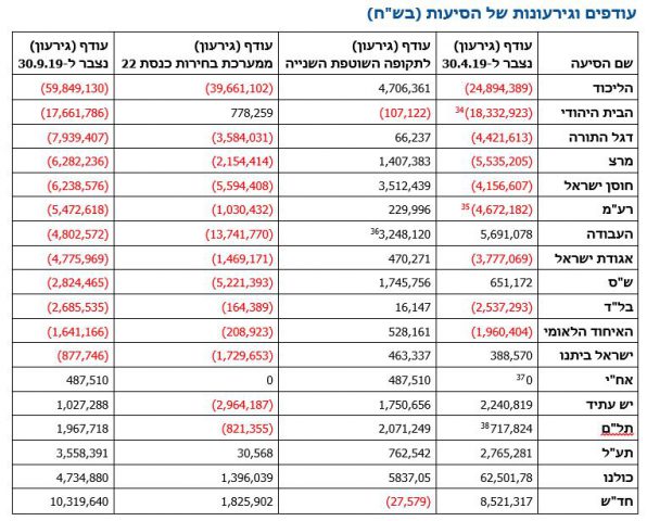 יש לציין כי המפלגות נוטות להיכנס לחובות במערכת הבחירות, אותן היה מכסה באמצעות מימון המפלגות המתקבל מתוצאות הבחירות (מענק חד פעמי בטור הימני) ומכספי מימון המפלגות השוטף – כמיליון שקל בשנה לכל מנדט. בהקשר זה הימין החדש שלא עברה את אחוז החסימה צברה חובות של 8 מיליון שקל, ולא תוכל להחזיר אותם.