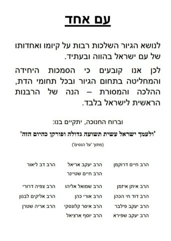 "לנושא הגיור השלכות רבות על קיומו ואחדותו של עם ישראל בהווה ובעתיד", כתבו הרבנים, "לכן אנחנו קובעים כי הסמכות היחידה והמחליטה בתחום הגיור ובכל תחומי הדת, ההלכה והמסורת הינה של הרבנות הראשית לישראל בלבד".