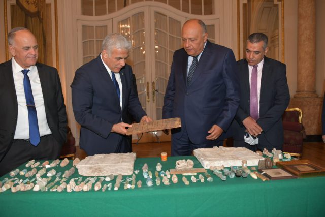 בשם מדינת ישראל החזירו השר לפיד ומנהל ראשות העתיקות אלי אסקוזידו פריטים אריכואולוגים מצריים שנתפסו בישראל לפני מספר שנים.