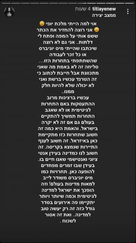 אינאו המשיכה וכתבה: "עכשיו ברצינות, מרוב ההתעסקות באם התחרות לגיטימית או לא שאגב התחרות תמשיך להתקיים בעולם גם אם זה לא יקרה בישראל, והאמת היא כמה זה חשוב שתחרות כזו מתקיימת כאן בישראל. זה חשוב לענף התיירות שנמצא בקריסה, זה חשוב לנו כמדינה בעידן אנטי ציוני ואנטישמי שאנו חיים בו".
