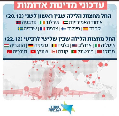 בהתאם, המדינות: איטליה, ארה"ב, בלגיה, גרמניה, הונגריה, מרוקו, פורטוגל, קנדה, שווייץ ותורכיה – יוגדרו כאדומות החל ממחר בחצות – הלילה שבין שלישי לרביעי, בכפוף לאישור ועדת החוקה של הכנסת.