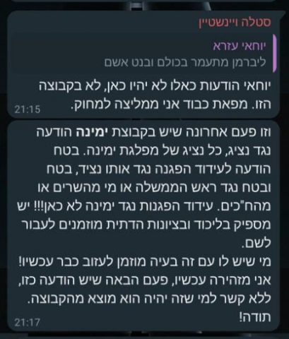 עוד היא כתבה: "זו הפעם האחרונה שישב קבוצת ימינה הודעה נגד נציג, כל נציג של ימינה. מי שיש לו עם זה בעיה מוזמן לעזוב כבר עכשיו! אני מזהירה עכשיו פעם הבאה שיש הודעה כזו, ללא קשר למי שזה יהיה הוא מוצא מהקבוצה".