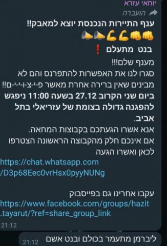 מצילום מסך מתוך אחת הקבוצות שהגיע לסרוגים, יוחאי עזרא, חבר מועצת העיר צפת מטעם ימינה, שלח בקבוצת ראשי המטות של המפלגה, הודעה על הפגנה של ענף התיירות.