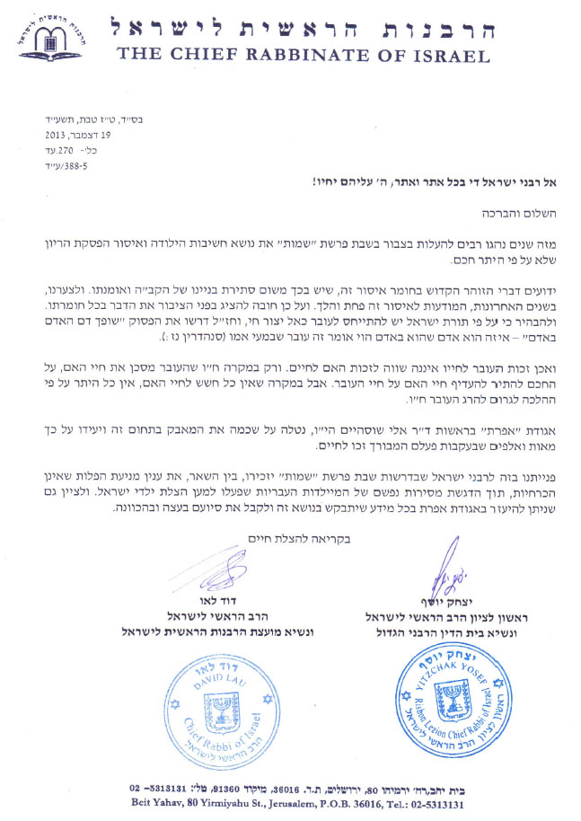 במכתבם חולקים הרבנים הראשיים שבחים לאגודת אפרת בראשות ד"ר אלי שוסהיים, ש"נטלה על שכמה את המאבק בתחום זה ויעידו על-כך מאות ואלפים שבעקבות פעלם המבורך זכו לחיים".