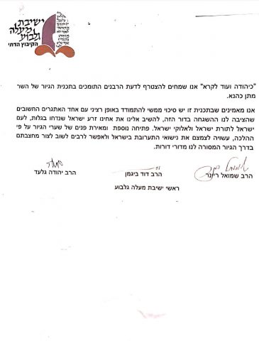 תמיכת הרבנים במתווה הגיור של השר לשירותי דת מתן כהנא:  אחרי תמיכת ראשי הישיבות בגוש עציון, בהר ברכה, במחניים ובעתניאל, ותמיכה של זקני הציונות הדתית בהם הרב איתן איזמן והרב יעקב ורהפטיג, כעת גם יוצאים ראשי ישיבת מעלה גלבוע, הרב דוד ביגמן, הרב יהודה גלעד והרב שמואל ריינר, בתמיכה פומבית במתווה הגיור של השר כהנא ומחזקים את החשיבות בקיום המתווה.