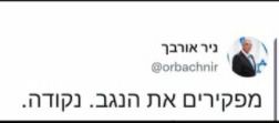 יש לציין שבציוץ המקורי של אורבך לפני מספר שבועות נכתב: "לא מפקירים את הנגב. נקודה", וכאמור בן שמעון עשה שינוי בתמונה והוריד את המילה "לא".