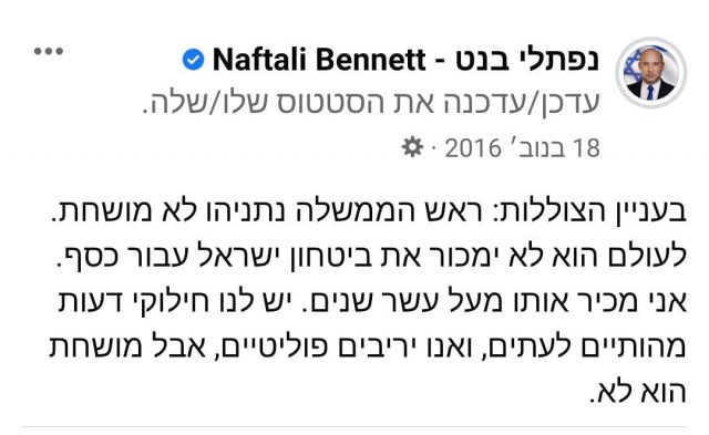 בפוסט שכתב בדף הפייסבוק שלו בחודש נובמבר 2016, כתב בנט: "בעניין הצוללות: ראש הממשלה נתניהו לא מושחת. לעולם הוא לא ימכור את ביטחון ישראל עבור כסף. אני מכיר אותו מעל עשר שנים. יש לנו חילוקי דעות מהותיים לעתים, ואנו יריבים פוליטיים, אבל מושחת הוא לא."
