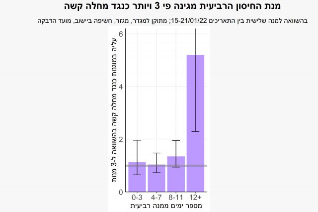 במשרד הבריאות מודיעים כי מנת החיסון הרביעית לגילאי 60 ומעלה מגנה פי 3 ויותר כנגד מחלה קשה ופי כ-2 כנגד הדבקה, בהשוואה למחוסנים ותיקים בשלוש מנות.