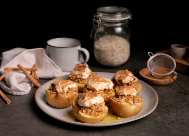 ממלאים את קערות התפוחים במעט קרמבל ואופים ב-180 מעלות צלזיוס במשך 30-40 דקות לפי הטעם.