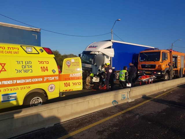 ממד"א נמסר: "בשעה 06:59 התקבל דיווח במוקד 101 של מד"א במרחב כרמל על ת.ד בין 2 משאיות בכביש 6 ממחלף אליקים לצפון. חובשים ופראמדיקים של מד"א מעניקים טיפול רפואי ומפנים לבי"ח רמב"ם 2 פצועים, בהם גבר כבן 50 במצב בינוני עם חבלה בגב ו- 1 קל".