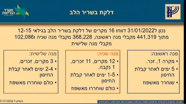 בקבוצת הגיל 12-15, עד כה חוסנו 441,319 ילדים במנה הראשונה, מתוכם 368,228 הספיקו מנה שנייה. את מנת הבוסטר קיבלו 102,086.