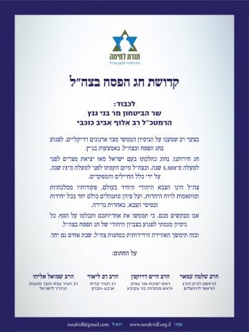 אנו מבקשים מכם, כי תממשו את אחריותכם ותבלמו על הסף, כל ניסיון מגמתי לפגוע בצביון היהודי של חג הפסח בצה"ל, ובזה תימשך האווירה הידידותית במחנות צה"ל, שבת אחים גם יחד".