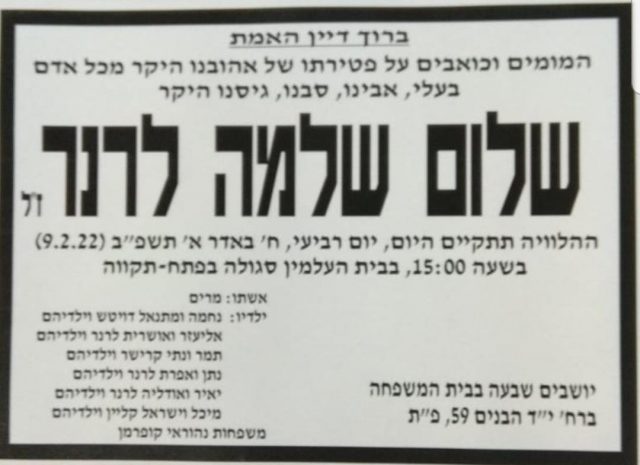 ההלוויה תתקיים היום בשעה 15:00 בבית העלמין סגולה.