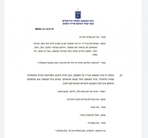 שופט: "מעולם לא קרה לי. זה היה אתמול, גם כן שעורך הדין שלך כתב, דברים שכמותם לא קראתי ולא שמעתי. ודווקא מציבור שלכם, שלך, ושלו, ושלו. (כל האנשים שהוא דיבר עליהם דתיים). לשמוע דברים כאלה כלפי מערכת המשפט, אבל זה אתם. וזה בסדר".