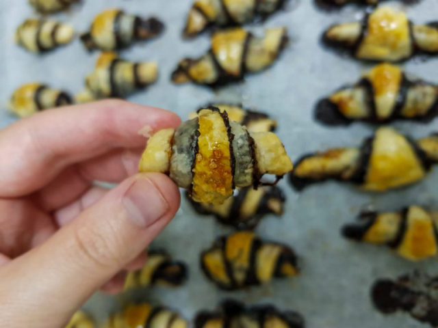 מקפלים את הבצק לאורך, ומרדדים מעט שוב להטמעה של המילוי. בעזרת גלגלת פיצה חותכים את הבצק לאורכו, ולאחר מכן יוצרים משולשים.