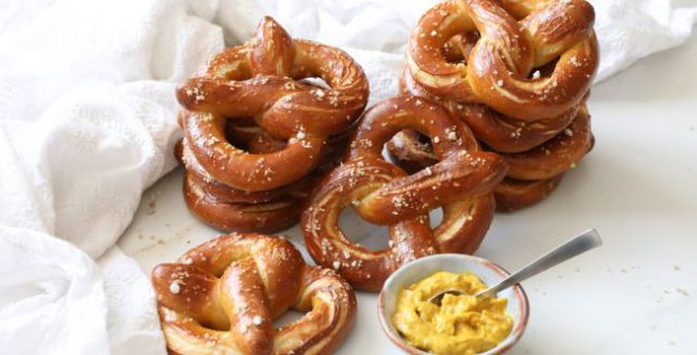 6. הברישו את הפרעצלס בעזרת החלב הצמחי/הביצה ופזרו מעליהם מלח גס. לאחר מכן הכניסו לאפייה בתנור למשך 15-17 דקות בחום של 220ºC עד להשחמה.
