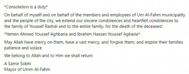 ראש עיריית אום אל-פחם מסר: "הפוסט עלה לדף הפייסבוק ללא אישורי ולא על דעתי, מדובר בטעות חמורה של הדוברות. ביקשתי להסיר מיד את הפוסט, והנושא כעת בבדיקה מול הגורמים הרלוונטים. אנו מתנערים מהפרסום הזה שלא מייצג את אום אל-פחם והעירייה שלה".