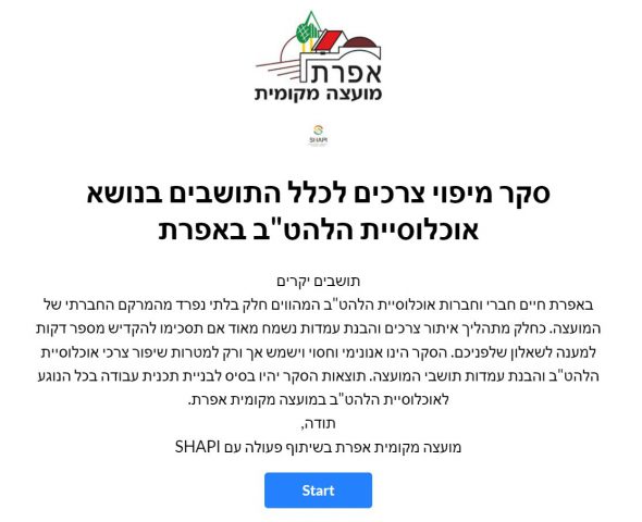 בדף הפתיחה של הסקר, הנושא את סמל המועצה נכתב: "תושבים יקרים, באפרת חיים חברי וחברות אוכלוסיית הלהט"ב המהווים חלק בלתי נפרד מהמרקם החברתי של המועצה", התושבים מתבקשים להשיב לסקר "כחלק מתהליך איתור צרכים והבנת עמדות", ובמועצה מצהירים כי "תוצאות הסקר יהיו בסיס לבניית תכנית עבודה בכל הנוגע לאוכלוסיית הלהט"ב במועצה מקומית אפרת".
