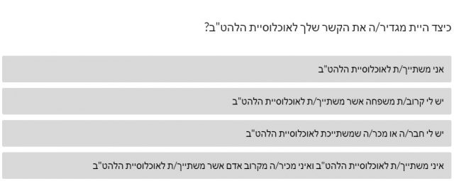 הסקר נפתח בשאלות כלליות יחסית לגבי מידת ההכרה עם המונח להט"ב ומרכיביו, ולאחר מכן עובר לשאלות פרקטיות על מידת ההכרה והחשיפה ללהט"בים בקרב המשפחה, מכרים או בכלל?