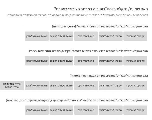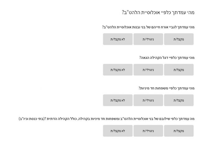 אחרי עוד מספר שאלות, כבר מגיעות שאלות על קבלת הלהט"ב בקהילה, ועל היחשפות של תופעות המתנגדות ללהט"ב, כשהן מכונות הומופוביה: