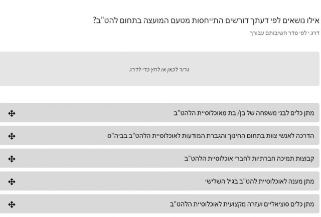 בשלבים האחרונים של הסקר, הוא כבר עובר לסוג של נורמליזציה לגילויים להט"בים, בשאלות על הנפת דגל צבעי הקשת באופן קבוע בתחומי המועצה, או שאלת דירוג לנושאים להט"בים, בלי לתת את האפשרות לשאול האם הדבר בכלל נצרך
