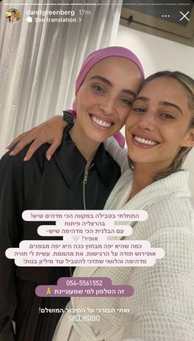 "התחלתי בטבילה במקווה הכי מדהים שיש!" כתבה דנית לעוקבות שלה באינסטגרם, "עם הבלנית הכי מדהימה שיש – אופיר, כמה שהיא יפה מבחוץ ככה היא יפה מבפנים" כתבה והוסיפה תמונה שלה יחד עם הבלנית.