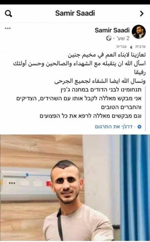 "תנחומינו לבני הדודים במחנה ג'נין", כתב סעדי בדף הפייסבוק לצד תמונת המחבל אחמד א-סעדי שחוסל היום כשפתח באש לעבר לוחמי ימ"ס ודובדבן שפעלו בעיר.