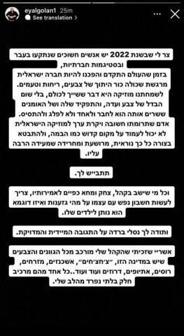 גם אייל גולן הגיב וכתב: "צר לי שבשנת 2022 יש אנשים חשוכים שנתקעו בעבר". עוד הוסיף: "אשריי שזכיתי שהקהל שלי מורכב מכל הגוונים והצבעים שיש במדינה הזו, "צ'חצ'חים, אשכנזים, מזרחים, רוסים, אתיופים, דרוזים ועוד ועוד".
