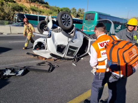 "נהגת הרכב נלכדה ברכבה שהיה הפוך על צידו ולאחר פעולות חילוץ מורכבות היא פונתה לבית החולים במצב בינוני. נהג הרכב השני שנפצע באורח קל טופל במקום ופונה גם הוא לבית החולים כשמצבו קל".