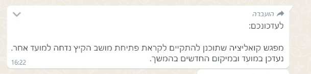 לפי לשון ההודעה: "לעדכונכם: מפגש קואליציה שתוכנן להתקיים לקראת פתיחת מושב הקיץ נדחה למועד אחר. נעדכן במועד ובמיקום החדשים בהמשך."
