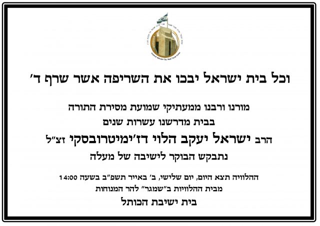 ברוך דיין האמת, הלך לעולמו הרב ישראל יעקב הלוי דז'ימיטרובסקי זצ"ל, ר"מ בישיבת הכותל.