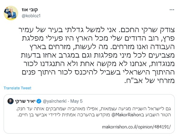 הסערה נוצרה לאחר שאוז צייץ מחדש את הטור של יאיר שרקי, שעוסק בישראל השנייה. אוז כתב: "צודק שרקי החכם. אני למשל גדלתי בעיר של עמיר פרץ, רוב הדודים שלי מכל הארץ היו פעילי מפלגת העבודה ואנו מזרחים".