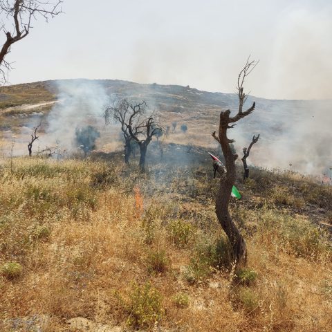 דגל פלסטין תלוי במקום השריפה (קרדיט: כבאות והצלה יו"ש)